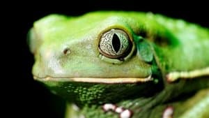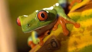 The second programme explores the world of amphibians, of which there are some 6,000 known species. Attenborough visits Australia to illustrate how they became the first back-boned creatures to colonise land: the lungfish, which is capable of breathing air, and whose ancestors became the first amphibians. The largest of them is the Japanese giant salamander and two are shown wrestling for territory. In North America, the marbled salamander spends most of its life on land, yet is still able to retain the necessary moisture in its skin through the damp leaf litter. A female caecilian is filmed with her young, whose rapid growth is discovered to be the result of eating their mother's skin — re-grown for them every three days. The most successful amphibians are frogs and toads. Their calls are most active during the breeding season: females are impressed by both volume and frequency. However, gestures are sometimes needed and the poisonous Panamanian golden frog uses a conspicuous form of 'semaphore'. Most other frogs rely on camouflage and the South American red-eyed tree frog is an example. An African bullfrog is shown defending its exposed tadpoles by digging a canal for them. Meanwhile, the male marsupial frog keeps its young moist by carrying them in its skin pouches. Under the Skin examines the filming of the last population of Panamanian golden frogs, which is threatened by a fungal disease.
