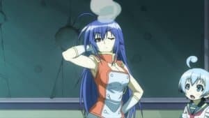 Onigase is chastising Kanoya, Yatsushiro, Moji, and members of the Kendo Club for their improper clothing, refusing to let them into the school building. Moji and his friends brush her off, much to her ire. Yatsushiro goes on to point out the Student Council, whose flagrant disregard for the school’s dress code horrifies Onigase. She confronts the Student Council in their office, calling out all of the members on the problems with their uniforms: Zenkichi on wearing his jersey under his jacket (to which he admits he was trying to get others to copy him) and Akune on wearing his uniform in a manner akin to Elvis Presley (he remarks that he can’t retaliate if she gets angry like that). After Onigase calls out Zenkichi and Akune on their uniforms, she turns to Kikaijima. While Kikaijima initially denies having made an alterations to her uniform, Onigase successfully reveals that she has been wearing her swimsuit beneath her uniform. Zenkichi wonders if Onigase has x-ray vision, while Akune can only wonder why Kikaijima was wearing her swimsuit. An embarrassed Kikaijima tries to claim she was testing Onigase, prompting Zenkichi to ask her why she is trying to act high and mighty now.